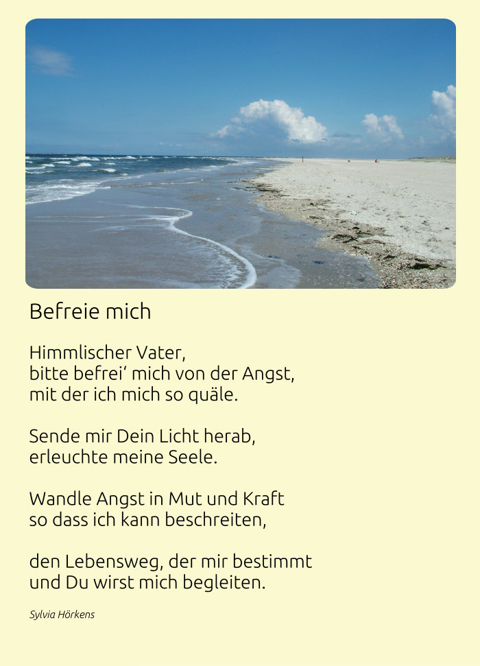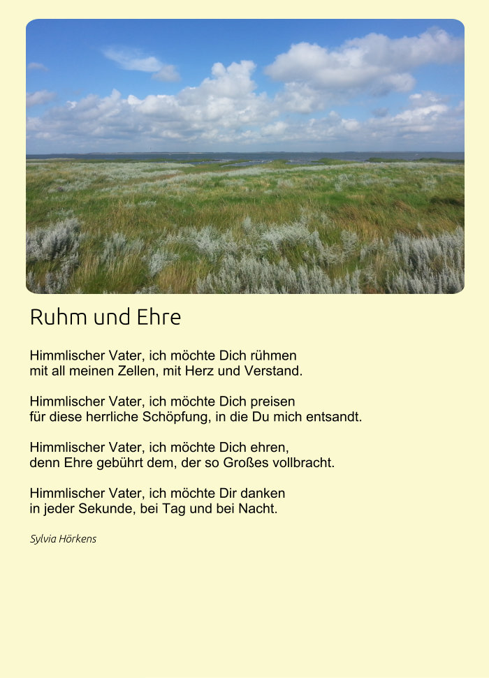In den Weiten des Himmels  In den Weiten des Himmels kann ich viel Schönes sehen, in den Weiten des Himmels vieles ahnen und verstehen.  In den Weiten des Himmels ziehen Vögel ihre Bahnen, in den Weiten des Himmels kann Unendlichkeit ich erahnen.  In den Weiten des Himmels tausend Wolken sich formieren, in den Weiten des Himmels kann ich Ewigkeit spüren.  In die Weiten des Himmels, oh welch herrliches Glück, in diese Weiten des Himmels kehrn wir zu Dir Herr zurück.  Sylvia Hörkens